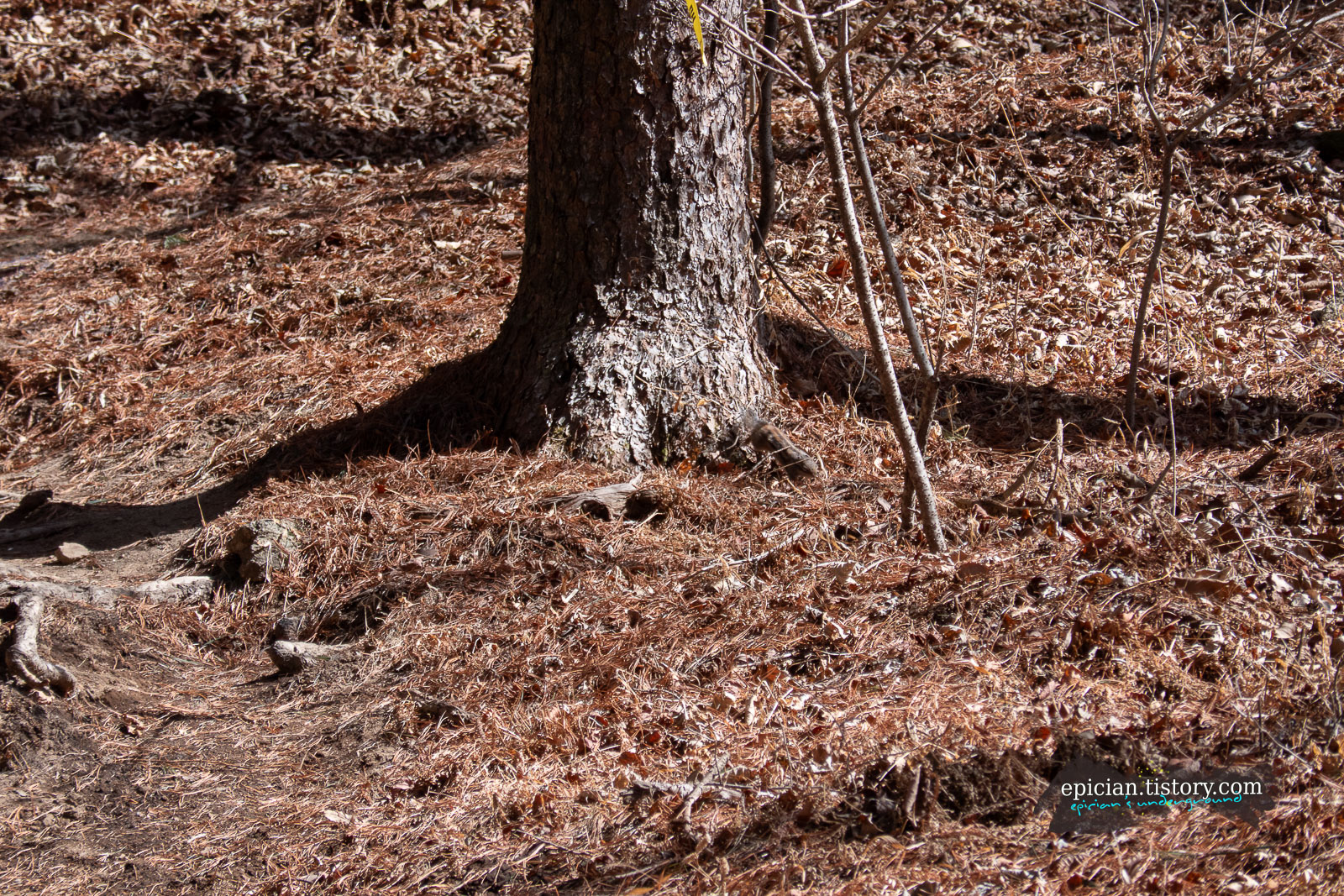 청설모 같은 게 눈에 들어왔는데, 그늘로 들어가니 어디로 갔는지 정말 찾기 어려웠다. 이 시기에 정말 절묘한 보호색 아닌가 싶다. 가까이 다가가니 다람쥐였다. 사람이 익숙하지 않은지 수십 미터 거리가 좀처럼 좁혀지지 않는다.